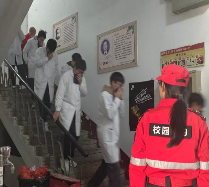 理论培训结束后,下午15:30,火灾应急疏散演练在化学实验教学中心正式启动。随着警报声骤响,模拟烟雾迅速弥漫教学楼,紧张气氛瞬间笼罩全场。按照预定疏散路线,师生们在实验室安全员和疏散引导员的指挥下,迅速用湿毛巾或防护布捂住口鼻,弯腰低姿、有序撤离。整个疏散过程紧张有序,仅用时6分钟,全体师生便安全集结至指定区域。随后,相关负责人立即清点人数,确认无人员遗漏。此次演练衔接顺畅,有效检验了应急预案的可行性,提升了师生的应急响应能力。