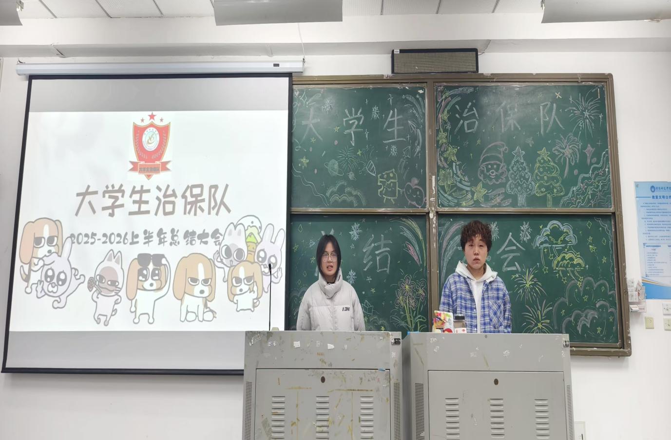 2026年1月4日晚,我校大学生治保队在厚德楼245教室召开2025年度总结表彰大会。本次会议以“守护校园平安,书写青春担当”为主题,系统回顾了过去一年的工作历程,表彰先进个人,凝聚共识,并展望未来发展方向。指导老师及治保队全体成员参加。